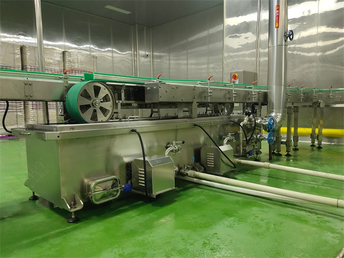 清洗 -> 2. 去皮 -> 3. 打漿/破碎 -> 4. 調(diào)配 -> 5. 融糖 -> 6. 均質(zhì) -> 7. 預(yù)熱 ->8. 空罐卸垛 -> 9. 空罐清洗(高壓噴淋) -> 10. 空罐吹干/瀝干 ->11. 自動(dòng)灌裝 -> 12. 抽真空/蒸汽噴射(排除罐頂空氣) -> 13. 真空封口 ->14. 殺菌 -> 15. 冷卻 -> 16. 吹干(去除表面水漬)-> 17. 噴碼 -> 18. 貼標(biāo) -> 19. 自動(dòng)開箱 -> 20. 自動(dòng)裝箱 -> 21. 自動(dòng)封箱 -> 22. 機(jī)器人碼垛 -> 23. 成品入庫