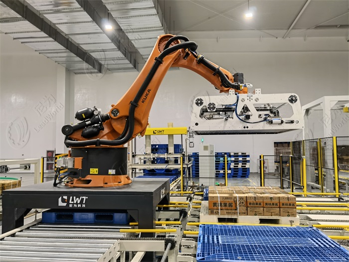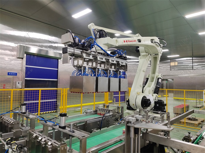 機(jī)器人碼垛機(jī)是機(jī)電一體化高新技術(shù)產(chǎn)品??砂凑找蟮木幗M方式和層數(shù),完成對料袋、膠塊、箱體等各種產(chǎn)品的碼垛。