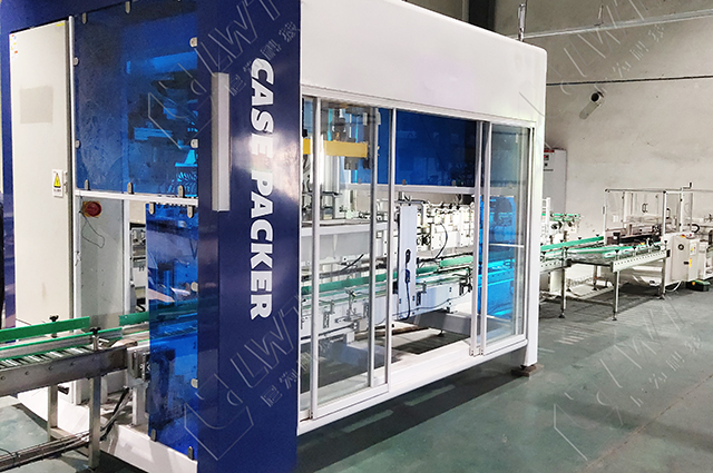 進瓶輸送線用于提供瓶子,罐子或其它待裝箱的物料輸送。進箱輸送線用于提供空箱,以便于裝箱機將物品裝入其中。吸瓶部件用于將物料抓取并放入紙箱的步驟。