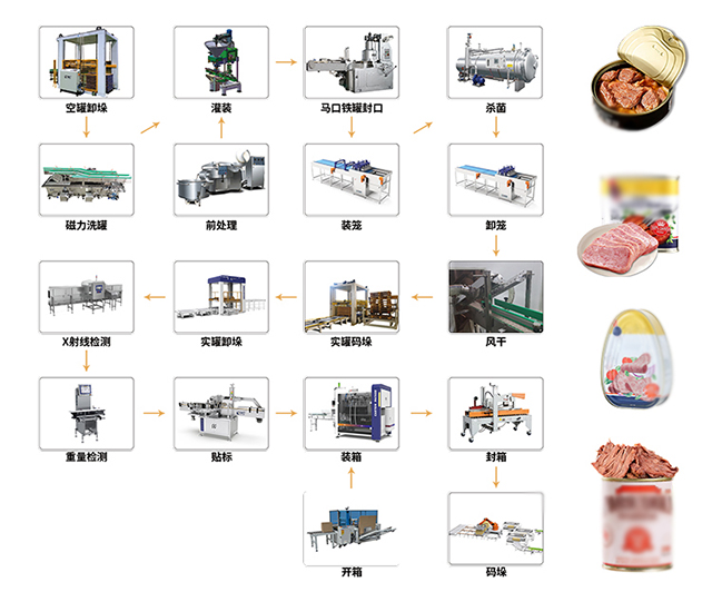 肉罐頭的生產(chǎn)工藝主要包括以下幾個步驟:原料處理、切塊、復(fù)檢、拌料、裝罐、排氣密封、殺菌冷卻、擦罐入庫。每一步都是確保產(chǎn)品質(zhì)量的重要環(huán)節(jié)。